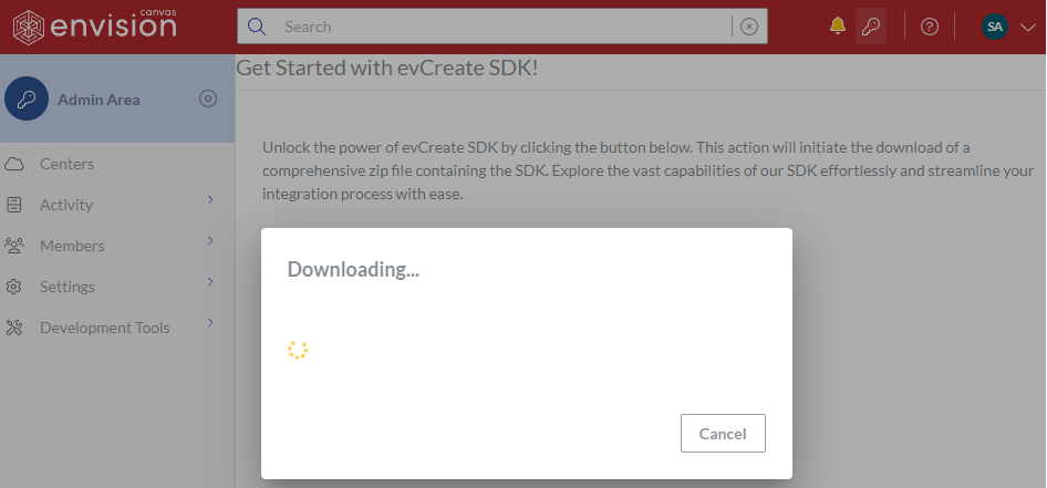 .Click the Download SDK button. The Downloading dialog pops up with a running spinner.