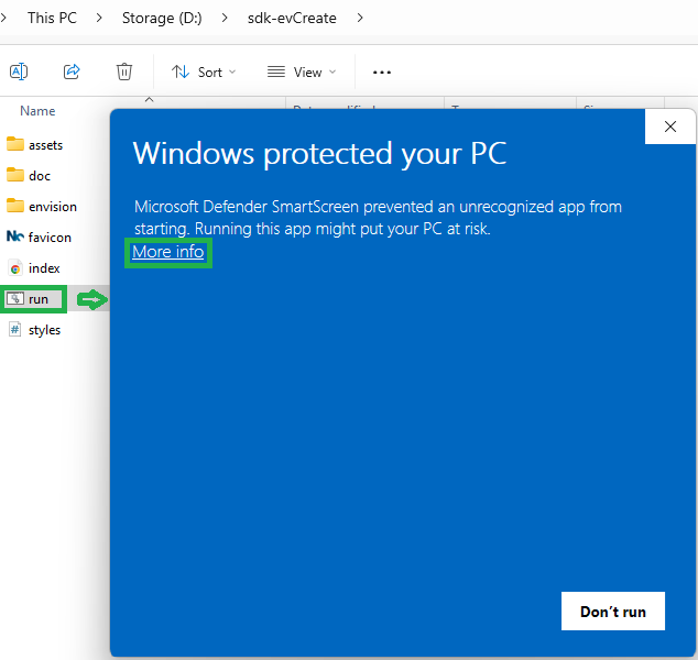 If you are running the index.html file for the first time, the Windows protected your PC warning message pops up.