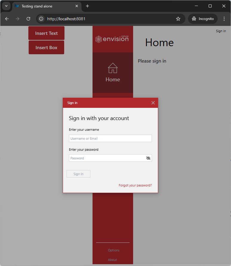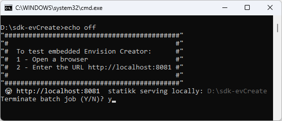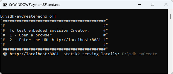To run the front end of the Canvas Envision Creator app embedded in a web page, you should host this web page. You can easily do this job with the Statikk web server launched with the run.batch file on Windows or with a command-line interface terminal on any supported OS. Alternatively, you can use any web server application of your choice.