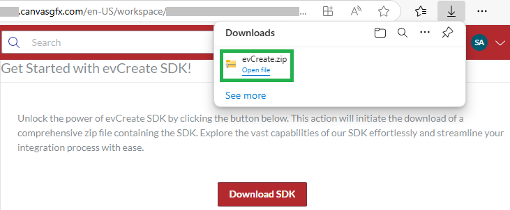 Once the downloading is completed, the Downloading dialog disappears, and the browser displays the evCreate.zip archive on the list of downloads.