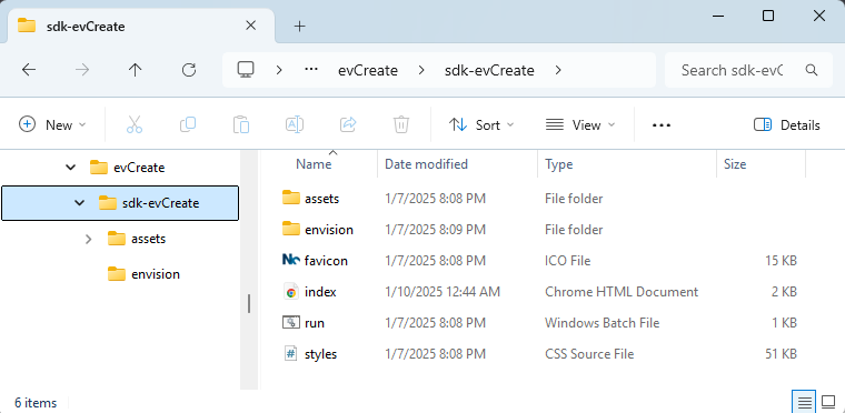 Extract the package from the evCreate.zip archive to the drive where you will develop, test, and host the embedded front-end app or custom code that will call the evCreate API.